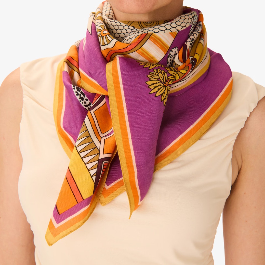 Grande foulard quadrato viola, in cotone e seta, della collezione Taj, da annodare intorno al collo o nei capelli.