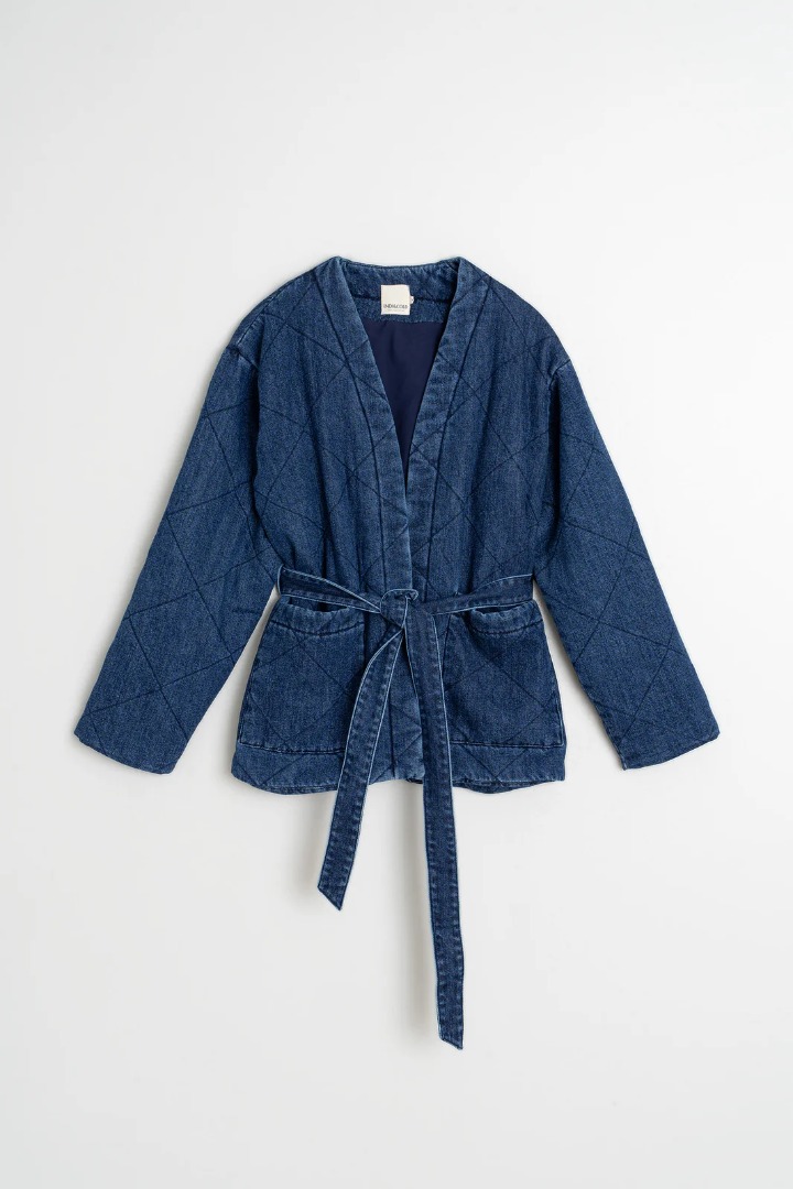 Giacca kimono in denim trapuntato con cintura removibile per regolare la vita. Ha una vestibilità comoda e può essere indossata da sola o abbinata ai pantaloni della stessa linea per creare un total look.