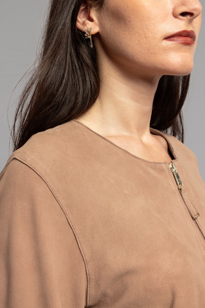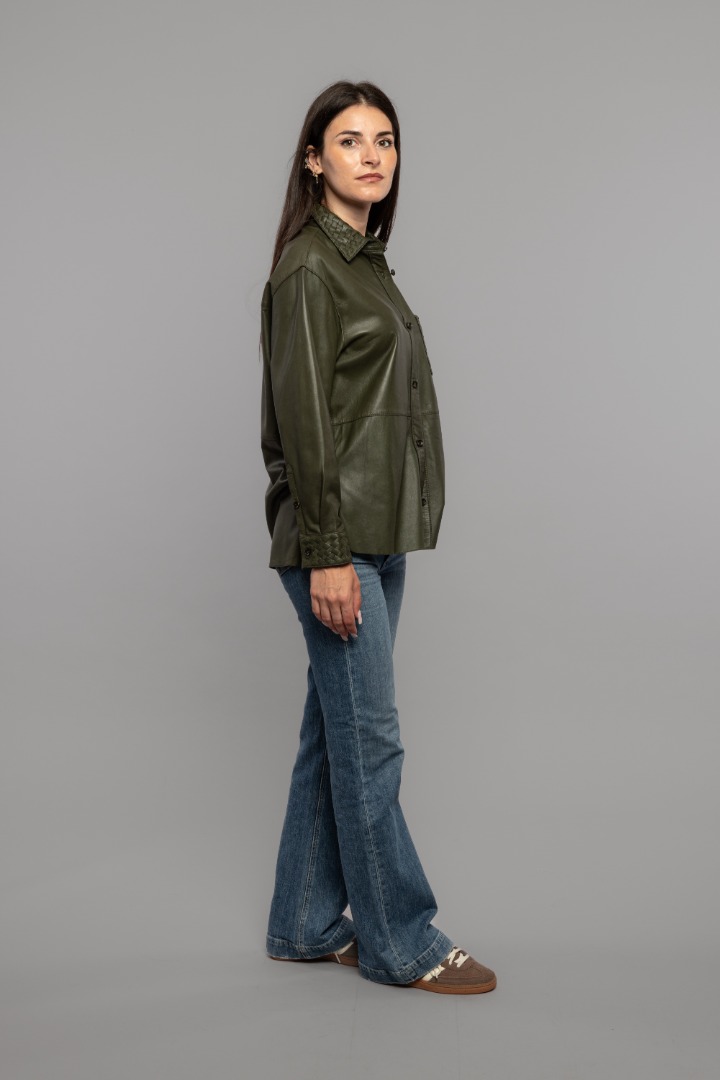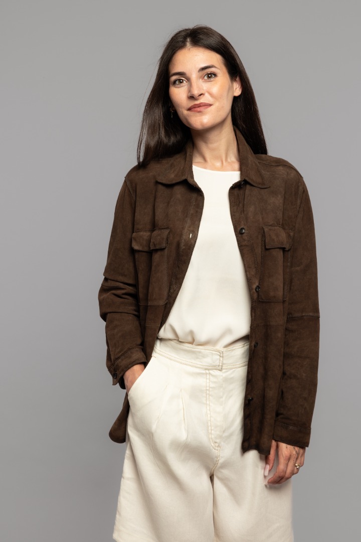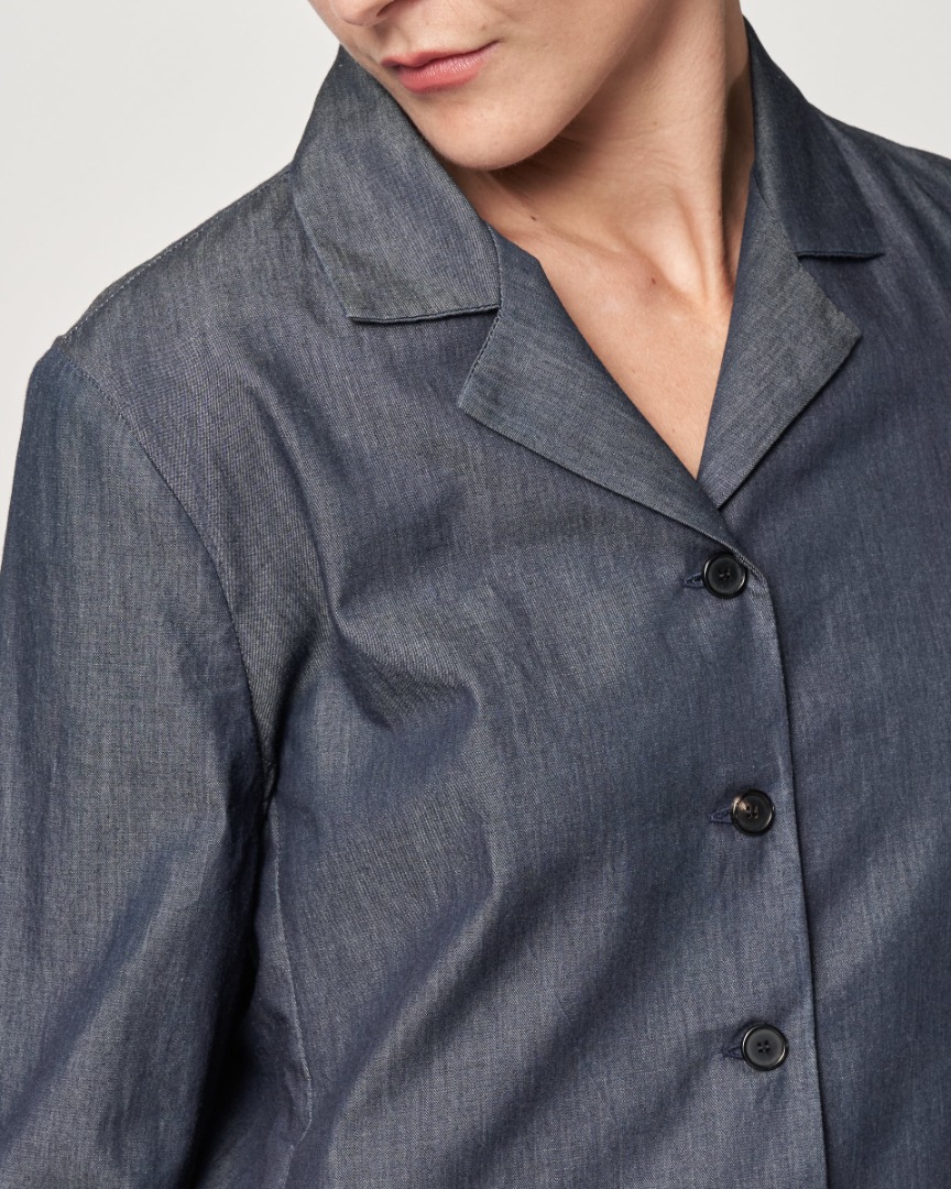 Giacca corta in cotone effetto denim. Collo camicia, chiusura a bottoni, maniche lunghe, fit leggermente cropped sopra i fianchi, spalle morbide.