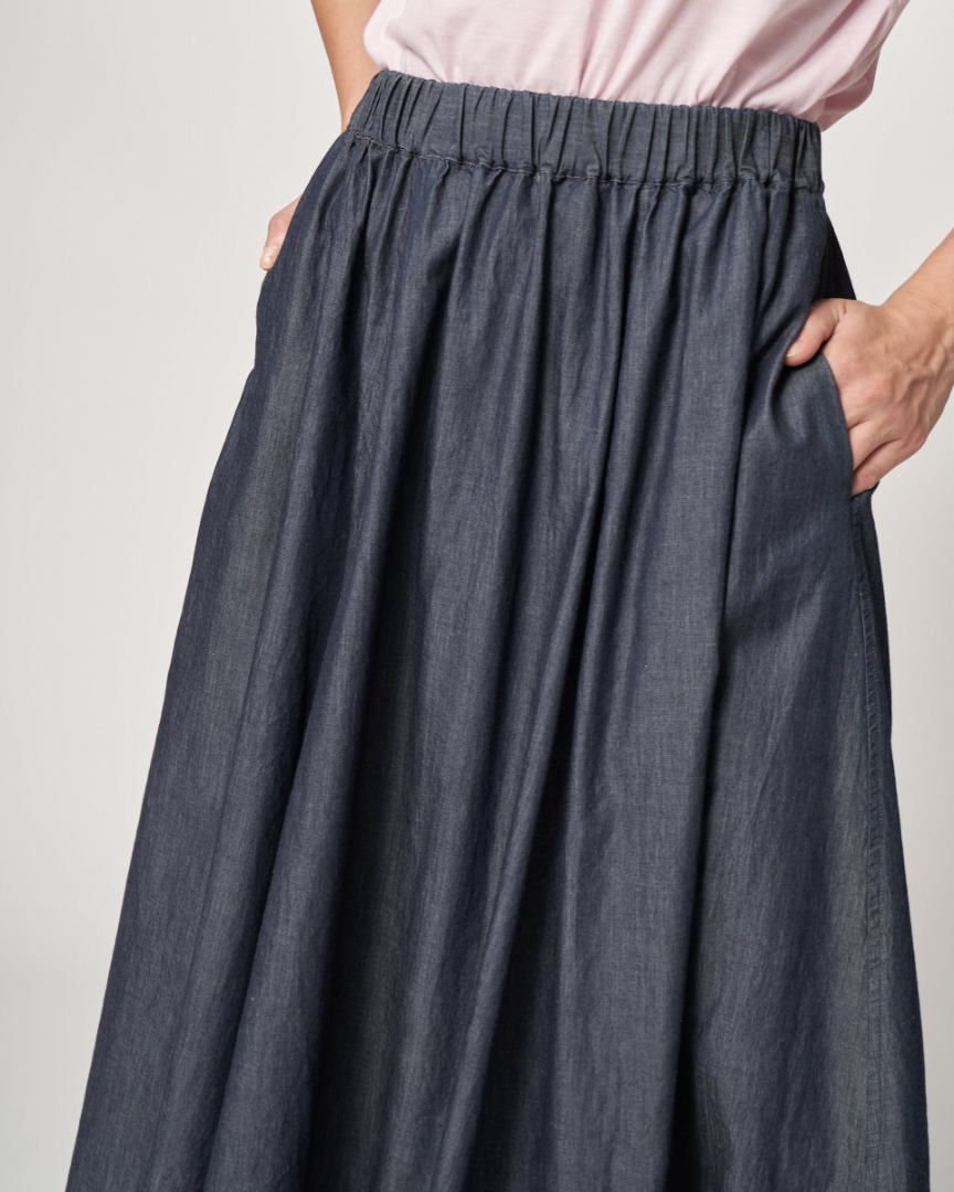 Gonna midi a ruota in cotone. Stile comodo e femminile con vita alta elasticizzata con coulisse interna, ampia gonna svasata che crea movimento.